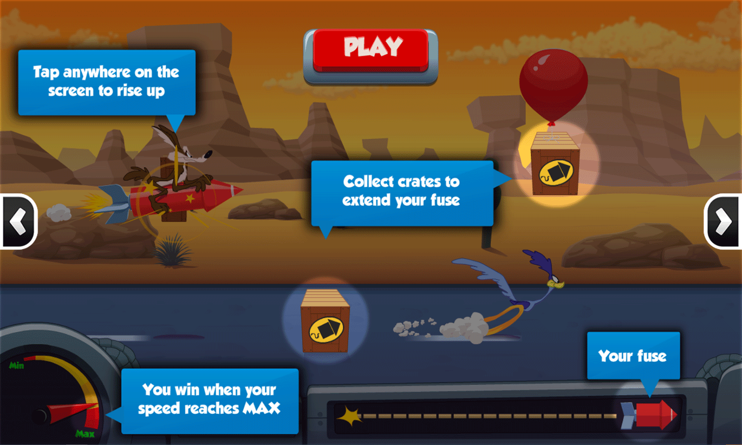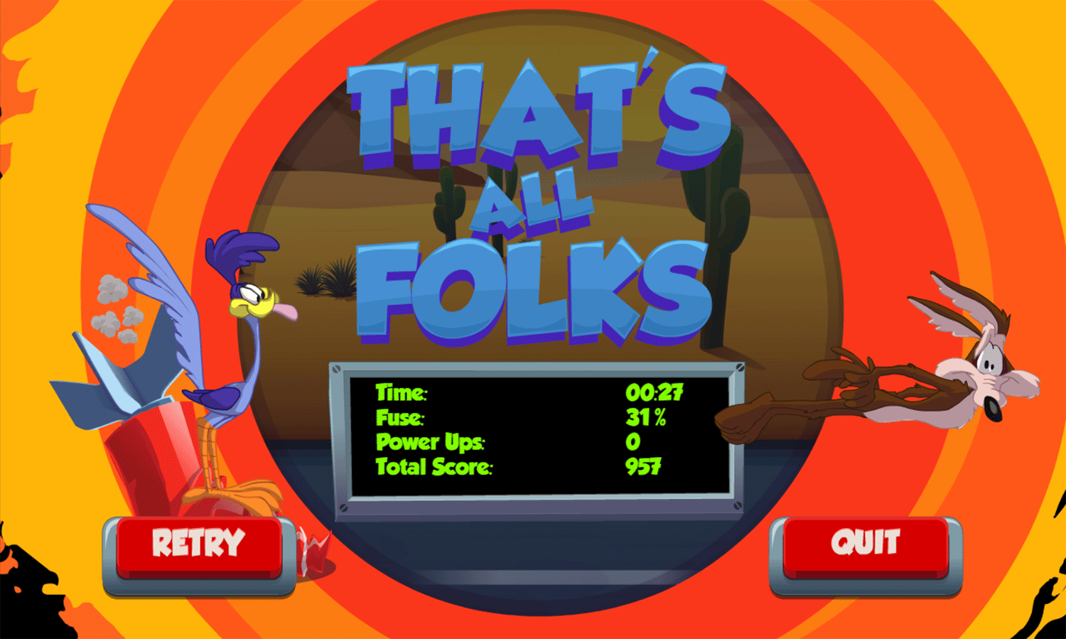 Je to veľmi dynamické dobrodružstvo, takže musíš pozorne sledovať obrazovku. Na ceste sa objaví mnoho prekážok a čím viac ich narazíš, tým rýchlejšie spadneš! Ak Wile E. Coyote narazí na zem, hra pre neho končí!
